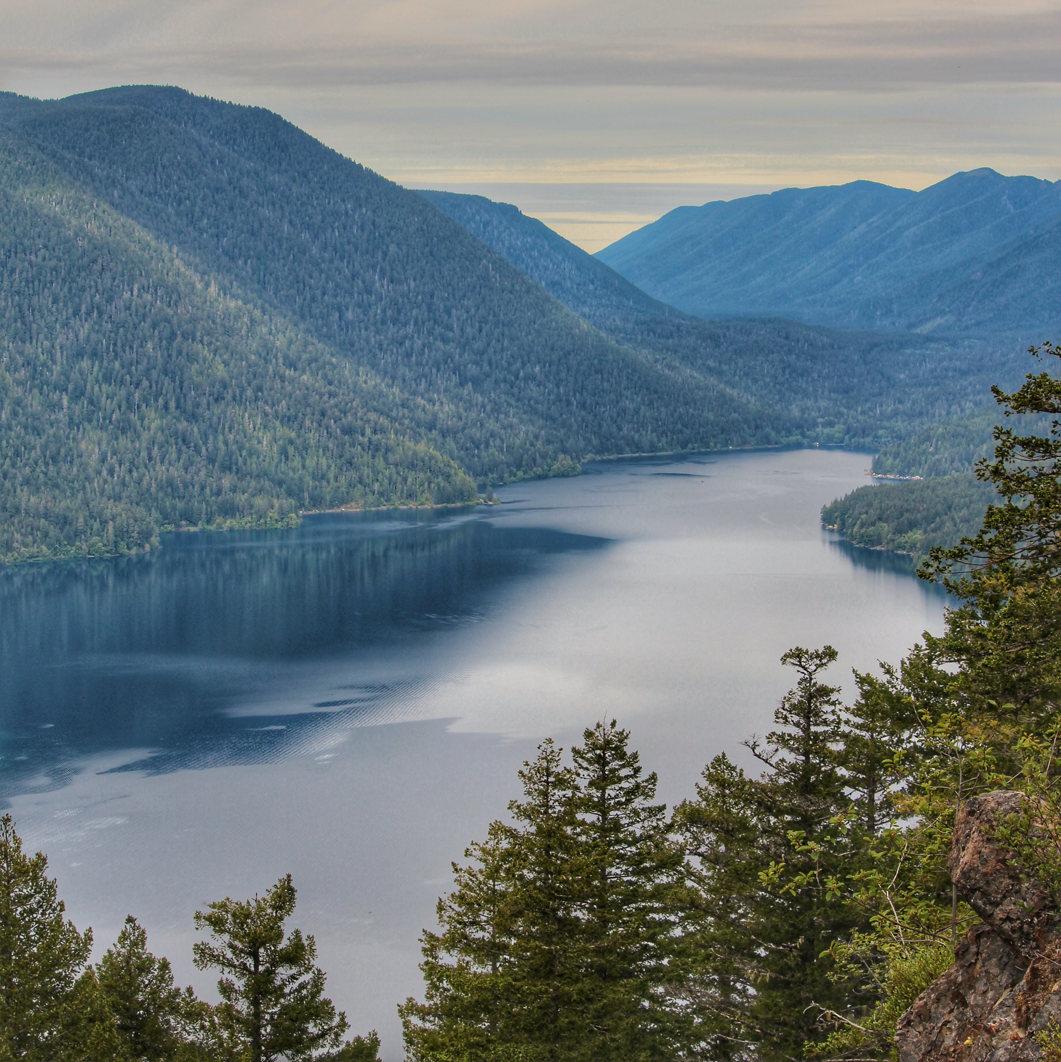 On the top, Lake Crescent is visible with its superior clear and crystal blue water. It’s the second deepest lake in Washington State with the deepest area of 190 m. The crystal blue color was caused by a lack of nitrogen in the water which inhibits the growth of algae.[3] Lake Crescent is the central of the park and surrounded by many trails. The upper section is only accessible by foot or bikes. It would be great to hop on a bike from Log Cabin and cycle the lake side through part of the Olympic Discovery Trial.[4]