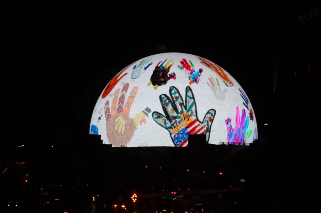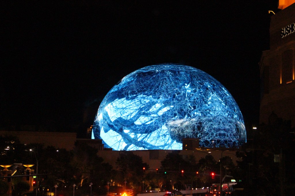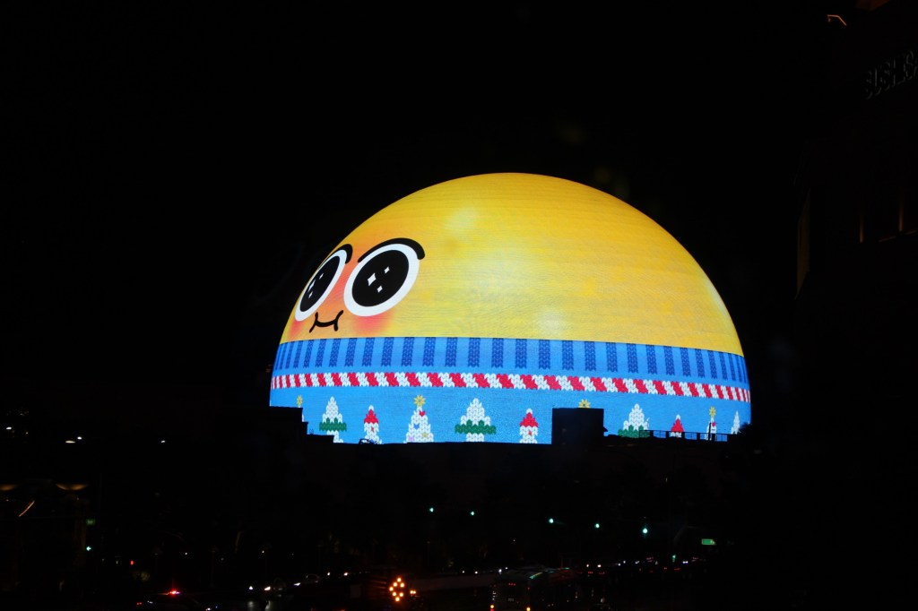 第二天,我们去参观拉斯维加斯2023年才开放的地标Sphere。我们还是将车停在了昨天的Treasure Island免费停车场,然后步行穿过威尼斯人酒店,从内部通道走到Sphere。Sphere是由Madison Square Garden公司打造的一座球形建筑,耗资23亿美元,号称是世界上技术最先进的表演场地。球型外部覆盖LED面板,可以展示高清的动态影像。