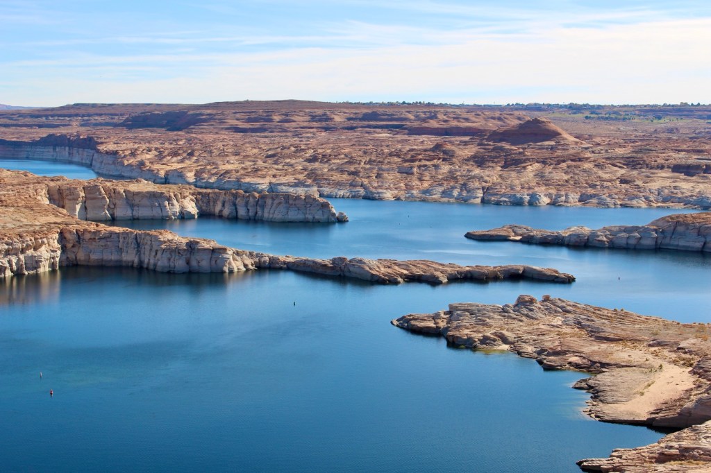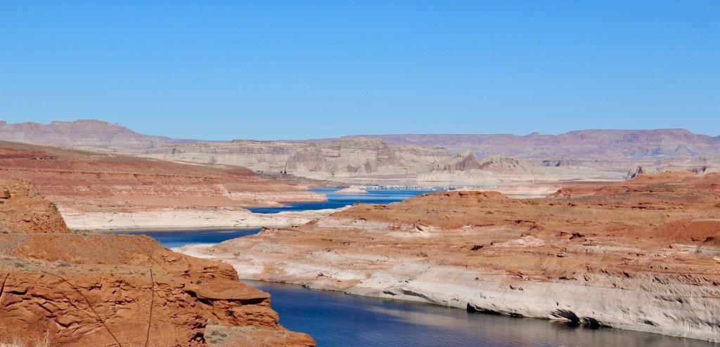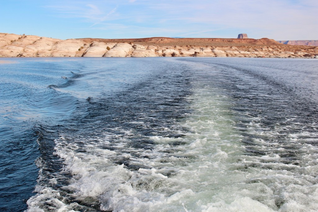 Lake Powell是由Glen Canyon Dam建成后形成的人工湖,其名字还是来源于美国探险家John Wesley Powell,跟大峡谷那个Powell是一个人。这片湖的储水量庞大,导游一路上为我们讲解了Lake Powell的地质历史和羚羊谷的形成过程,并提到由于近年来的气候变化,湖区的水位显著下降,露出了更多独特的岩层地貌。