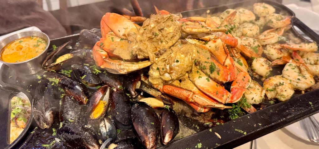 之后我们来到了Lombard Street,这条所谓的“最弯曲的街道”吸引了许多游客来打卡。附近的坡度起伏很大,随便走几步就能找到高处俯瞰旧金山市区的好地方。随后,我们搭车前往了Fisherman’s Wharf。虽然这里是旧金山的经典景点之一,但如今已经非常商业化,街道两旁都是礼品店,稍显杂乱。不过,我们沿着街道步行到了Pier 39,那里依然保留着一些有趣的亮点。Pier 39周围有一圈商业街,码头的天台是看海狮的最佳位置。最后,我们选择在Crab House用餐,我们点了seafood skillet,是欧式黄油蒜香风味,里面的螃蟹、虾和青口贝份量十足,味道鲜美。伴着码头的夜景用餐,十分惬意。