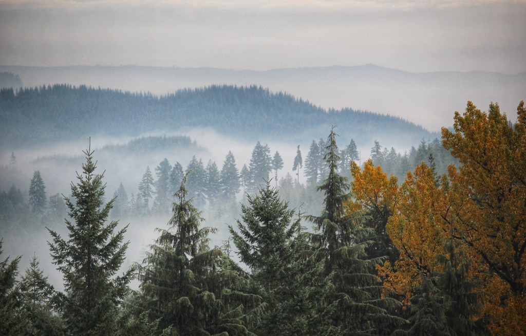 第二天,我们驱车前往Cannon Beach,这片沙滩曾被某知名杂志评为“世界上最美的沙滩之一”。一路向西行驶,我们穿过了Tillamook State Forest,雾气弥漫,枫叶点缀在静谧的山间,风景如画。这片森林曾因1920年代的多次火灾被毁,但经过后期的大规模植树恢复,如今已成为生态保护的成功典范。