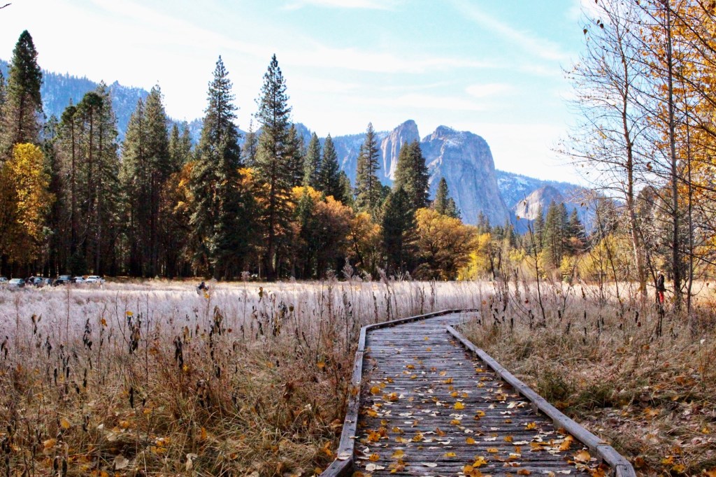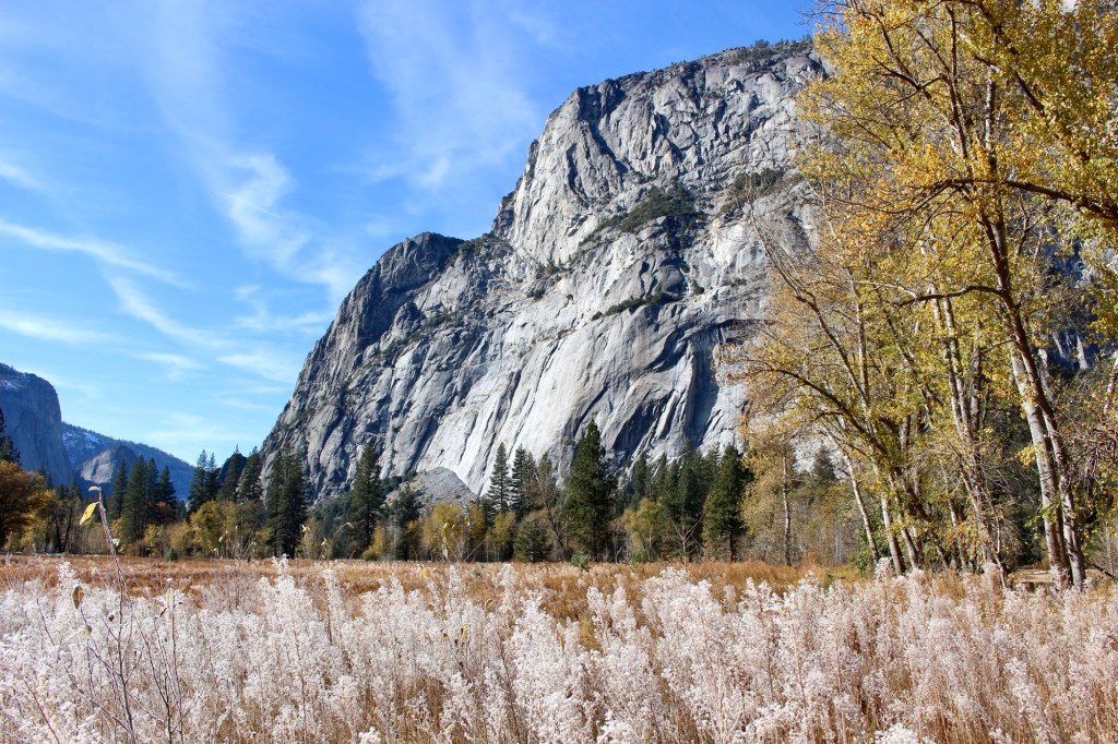 El Capitan Meadow:El Capitan是世界上最大的单体花岗岩岩石之一,石壁几乎垂直。我曾经去影院看过Free Solo纪录片,讲述的就是Alex徒手攀爬El Captain。岩石下面有一大片不知名植物上覆盖着冰晶,尤其是在雪后清晨,整个景象美轮美奂。