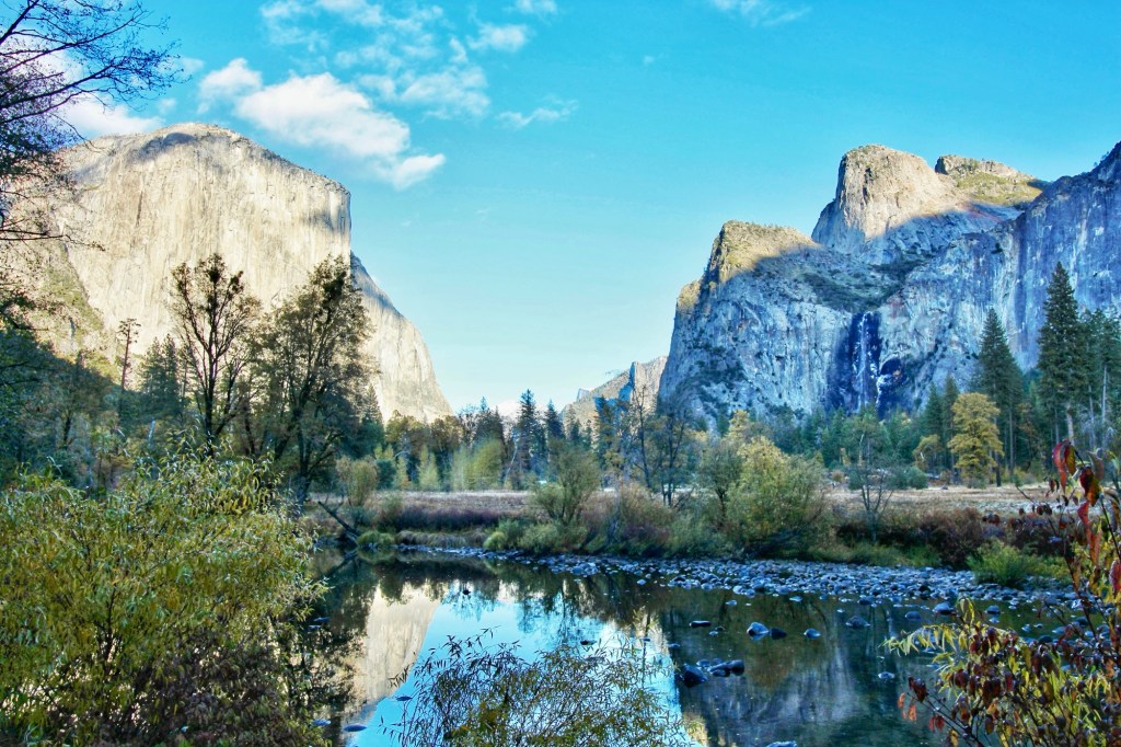 Lower Yosemite Falls:这里下午非常难找停车位。瀑布同样没有水流,但景色依然非常迷人。Yosemite Falls是园内最高的瀑布,高达739米。Lower Yosemite Falls是主瀑布的一部分,每年春季时水量较为壮观。最后,我们在Yosemite Valley View停留,拍到了夕阳下El Capitan和Bridalveil Fall的倒影。