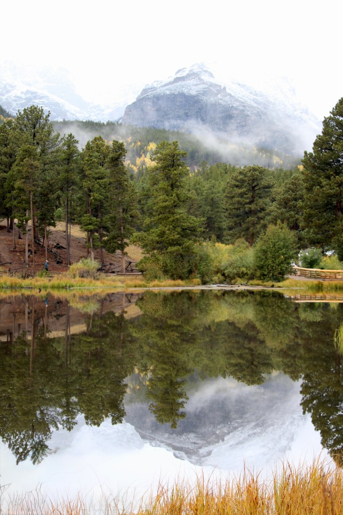 We entered the Bear Lake corridor right before 8 AM using our early morning permit. Started with a short walk around Sprague Lake, where we caught picture perfect mountain reflections in the calm water.