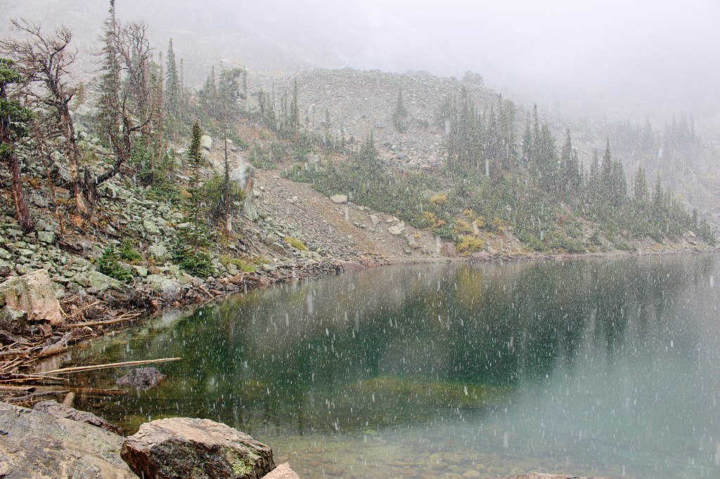 The best part of this hike is that as we climbed toward Dream, Emerald, and Haiyaha, a beautiful snowfall started mid-hike, transforming the landscape into a winter wonderland like something out of a fairy tale. The snowflakes danced around us, creating a magical atmosphere. The serenity of the moment allowed us to feel truly connected to the environment, embracing the quiet that only a snowfall can bring. It’s vital to have good gear for such adventures. The waterproof and windproof jacket and pants are essential to keep warm and dry, along with a sturdy hiking pole that provides balance on the slippery terrain. Additionally, protecting eyes from the reflection off the snow with quality sunglasses is important when walking in snowy conditions. Like the saying, it’s always no bad weather, but bad gears.