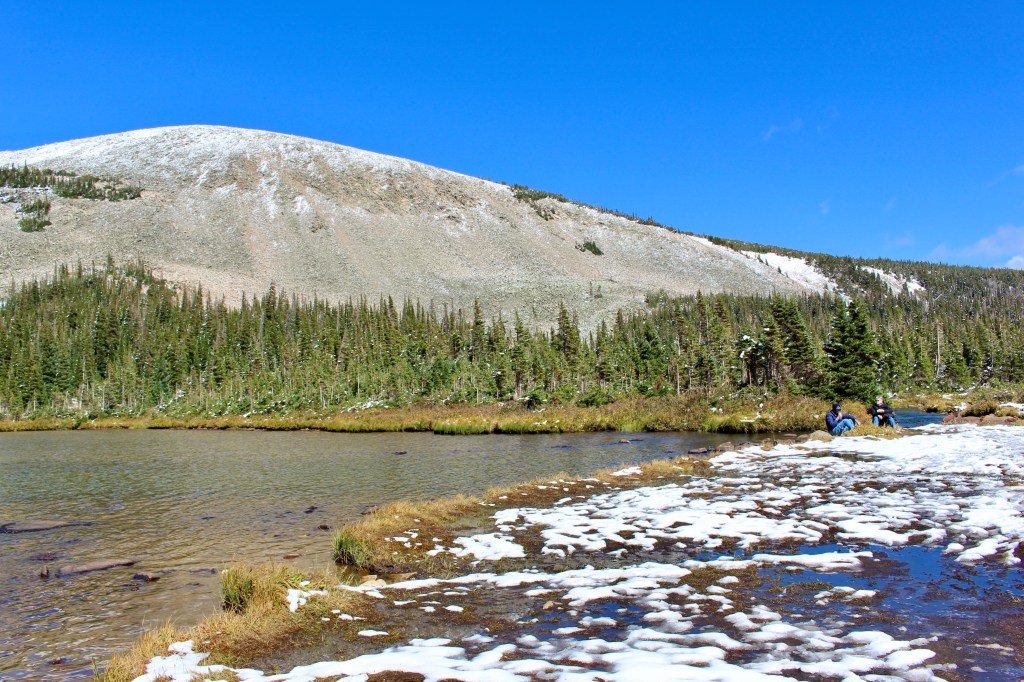 Poudre Lake: sunlight sparkled on the lake like a Monet painting. This is also the Continental Divide, where water flows either to the Atlantic or Pacific Ocean.
