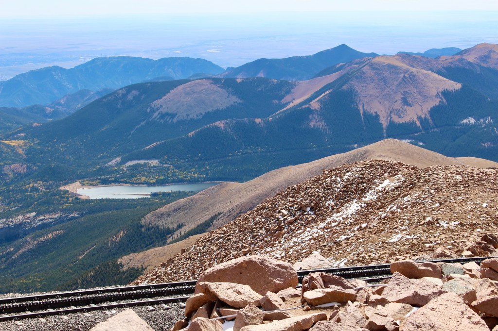 This was our last day. We drove to Colorado Springs and took the Pikes Peak Cog Railway, one of the highest railways in North America, climbing to 14,115 feet. We had 10 AM tickets. The depot parking opens at 9:30, and it gets crowded, so go early. The full journey takes about 3 hours: 1 hr 10 min up, 50 min at the top, and 1 hr back down. It was freezing at the summit, with wind and snow still on the ground, so bring layers!